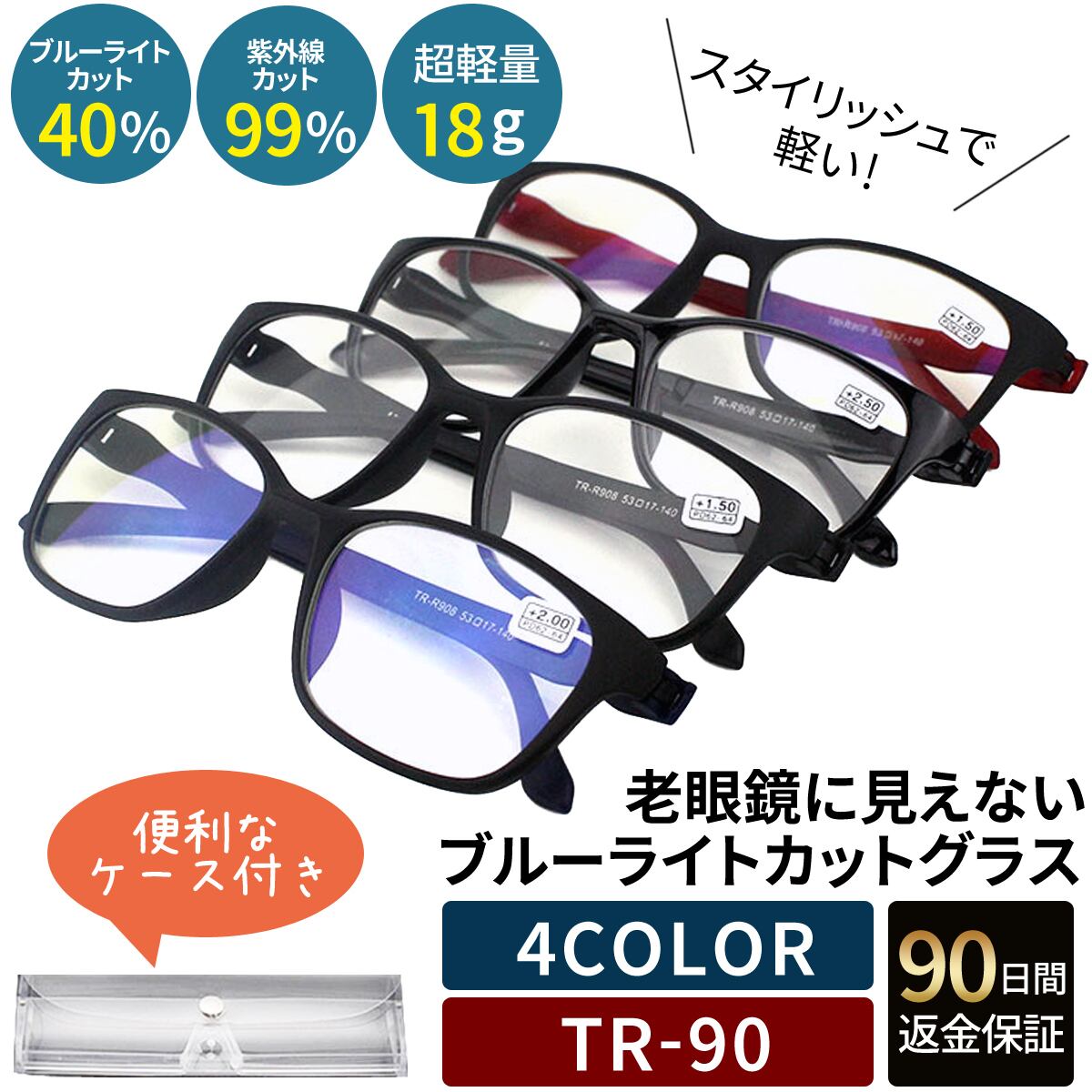 ・ブルーライトカット40%、紫外線カット99%で目に優しい。コスパも良いから、ポケット、カバン、ベッド、車の中、職場など、いたるところにリーディンググラスを置いて必要なシーンで気軽にご使用いただけます。ケース付きで持ち運びにも便利◎